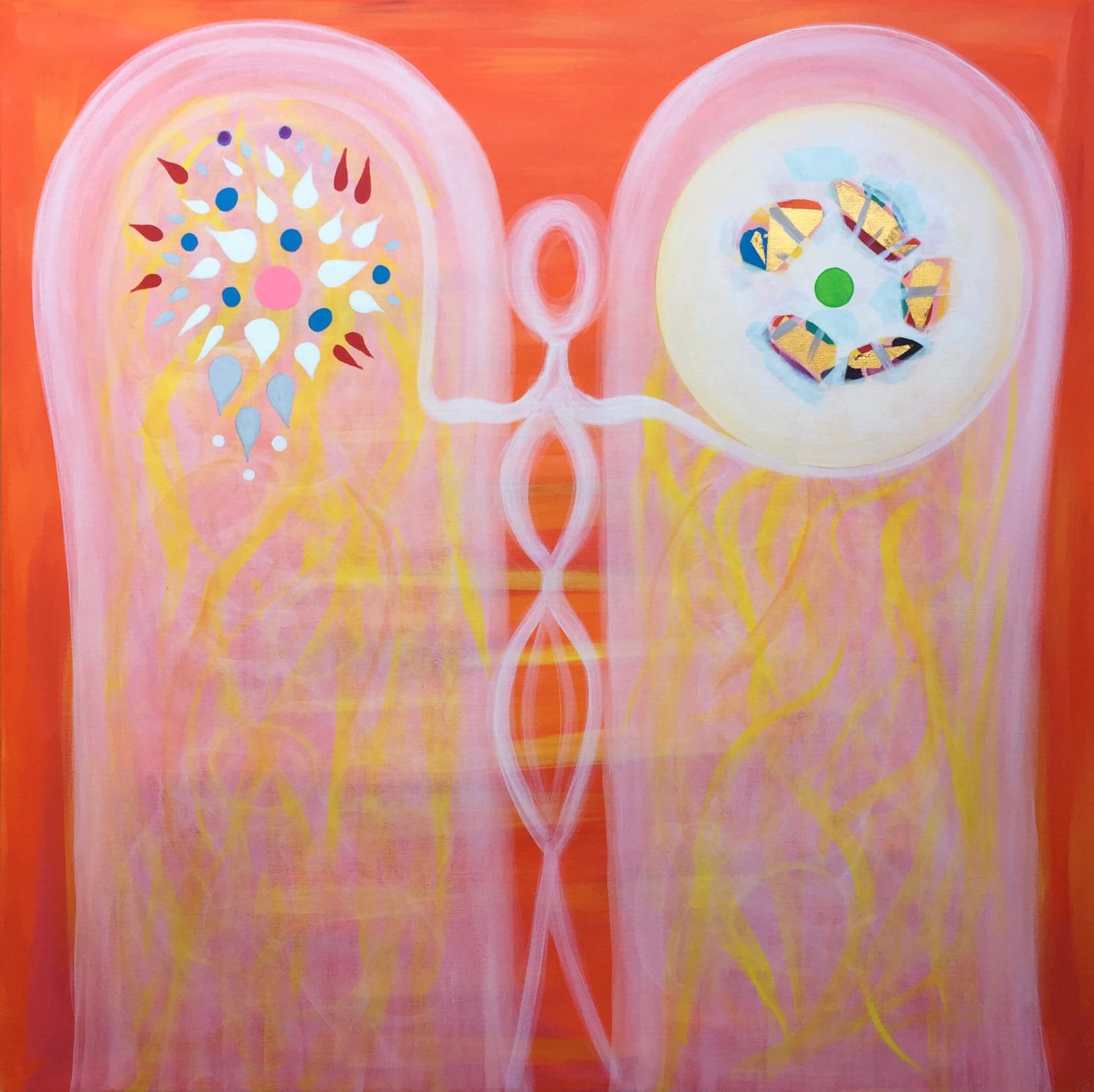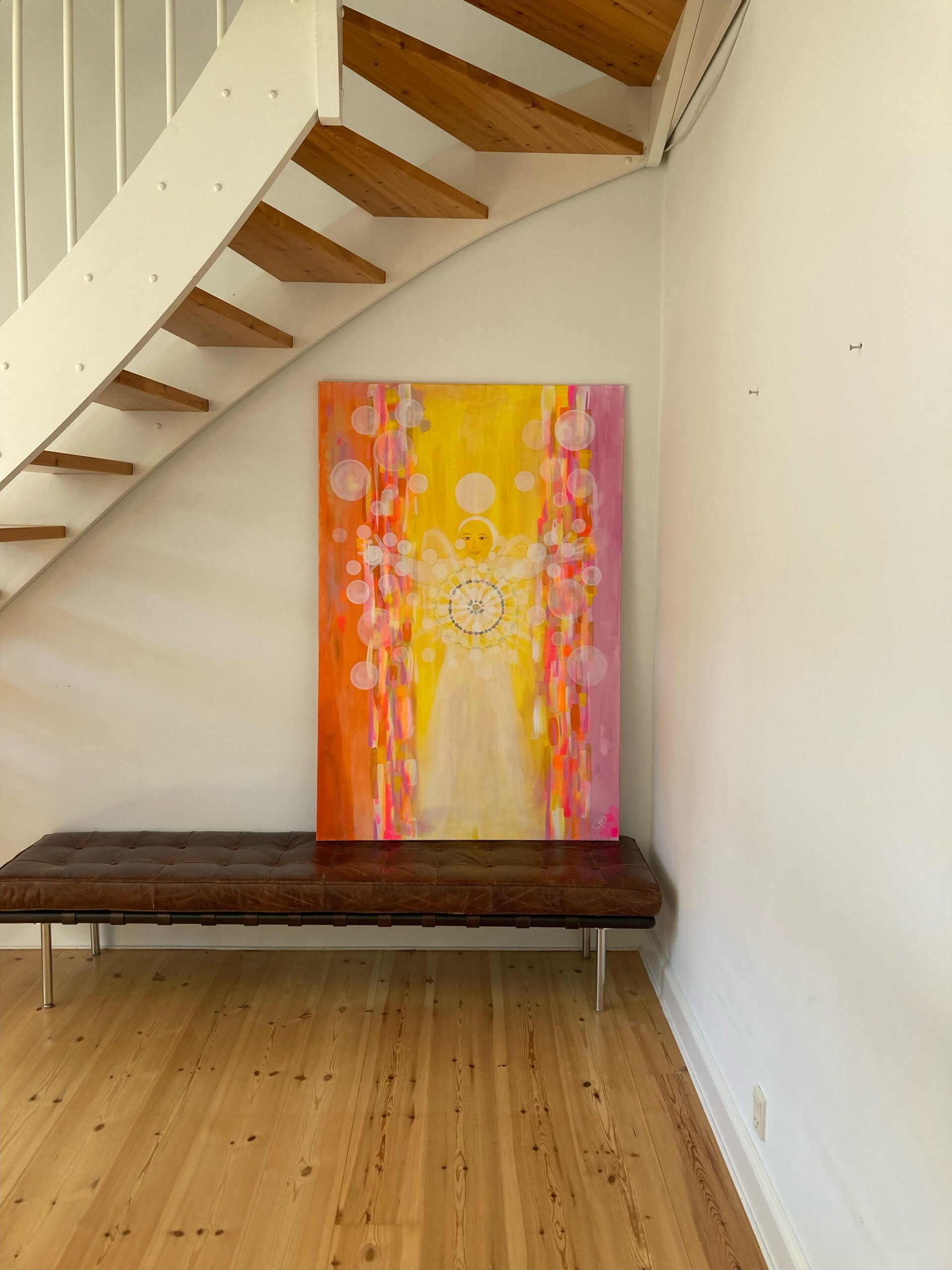 Med mine billeder vil jeg gerne sprede kærlighed, glæde, samhørighed og humor, for engle er også sjove. Farverne og formerne udtrykker power og er med at løfte energien til et sted, hvor der er overflod af alt, og hvor alle mennesker på jorden deler og lever i enhed med hinanden.